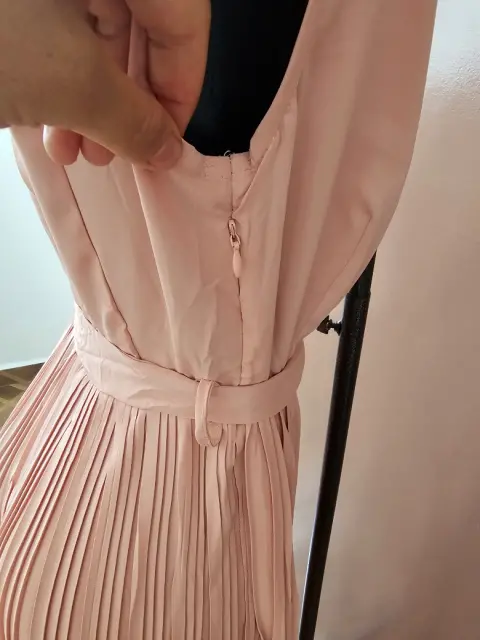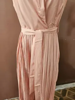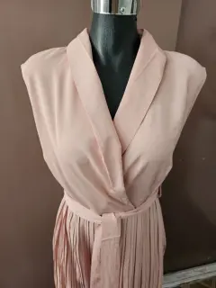 Prenda nuevaSpandex con poliesterPantalón tableada caída ampliaCon cierre al costadoViene con su lazo para ajustar másEscote en v con cuelloBlusaHombros 43Axila 43Cintura 34Cadera 45Largo 145