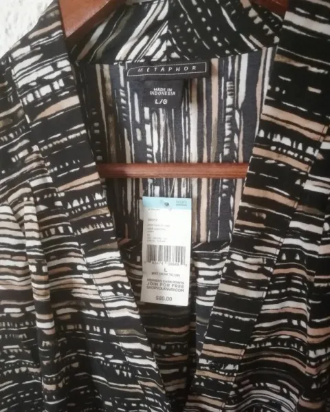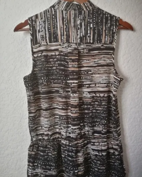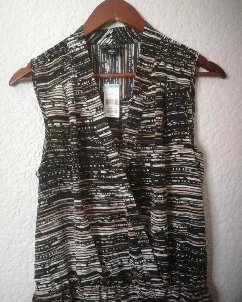 Nuevo con etiquetaTela estampada en tono negro, blanco y beigeCierre lateral, sin mangasLa tela es fresca, de la cintura estira el resto noMedidasAxila 53 cmLargo desde hombro 150 cm