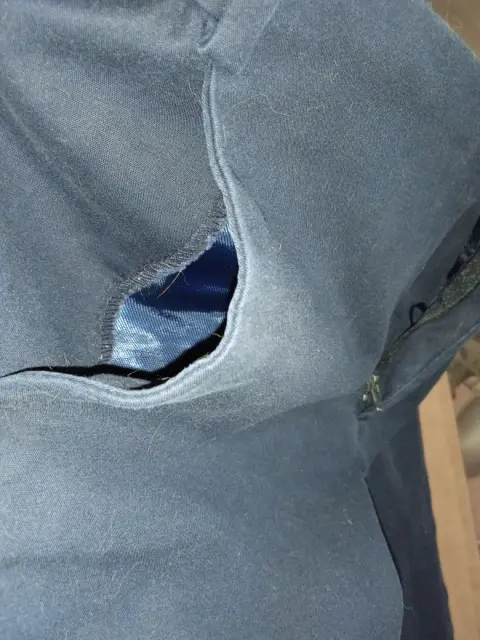 Corte recto muy formal, color azul marino, cierre y broche funcionan al 100. Bolsas frontales y detalle simulando bolsa parte trasera