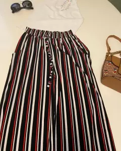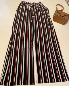 Pantalón acampanado. Pantalón rayado en colores negro, rojo y blanco, resorte en cintura, tiene una hermosa Caída, es acampando.