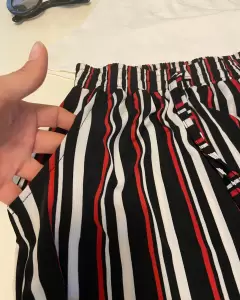 Pantalón rayado en colores negro, rojo y blanco, resorte en cintura, tiene una hermosa Caída, es acampando.
