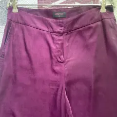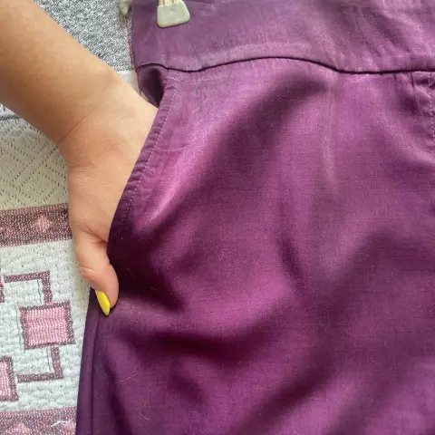 Pantalón amplio con bolsillos. Pantalón amplio de pierna ancha.Con dos bolsillos al frente, amplios.Luce elegante a la vez que es súper cómodo.La tela es fresca, brillosa. Da efecto aterciopelado.Talla 34 o grande. (Yo mido 80 cm de cintura y me queda un poco suelto).Color morado uva.52% poliéster y 48% viscosa.