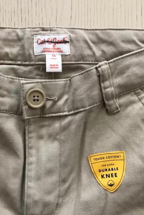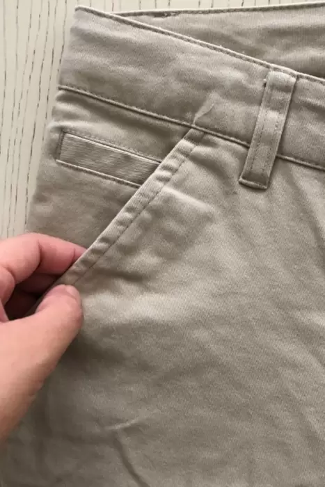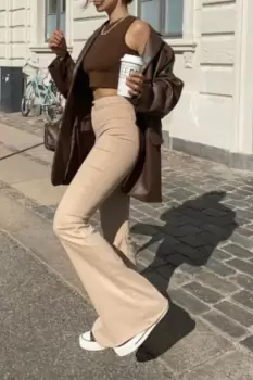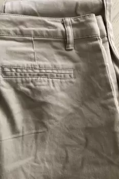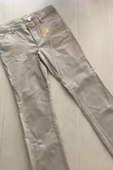 Pantalon beige corte bota o tipo acampanado, la tela es tipo gabardina, con bolsillos al frente, tiene muy poco spandex.Medidas:Cintura: 82 cmCadera: 87 cmLargo: 98 cm