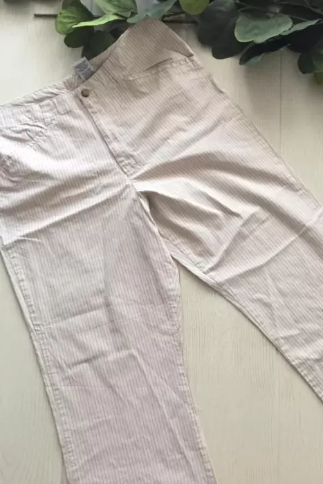 Pantalon beige con rayas. Pantalon beige con rayas, la primera imagen es solo representativa no es el mismo modelo, el pantalon es tela de algodon con un poquito strech, viene con bolsillos enfrente y atras, boton y cierre, el corte es pierna amplia sin ser acampanado, mas bien es recto.Medidascintura: 93 cmcadera: 113 caderalargo: 105 cm
