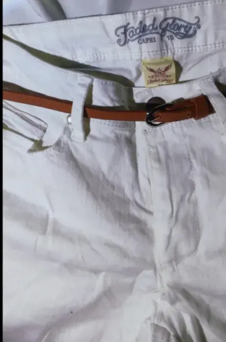 Pantalon Capri Mezclilla Blanco, 🤍🧷Tiro Alto, Cinturón con Hebilla, Bolsillos,🧷Tipo Pierna Recta, Ajuste regular, Cremallera 🏷️Talla M / 3497% Algodón, 3% Elástico, - Quitar cinturón antes de lavarlo,- Lavar con agua fría y con colores similares,- Usar solamente blanqueador sin cloro cuando se necesite,- Planchar en frío.