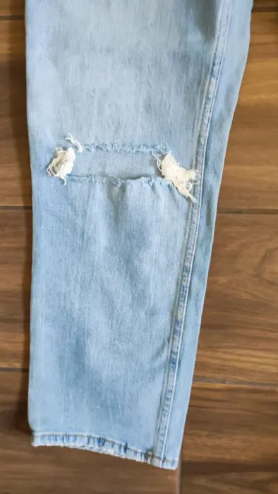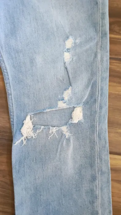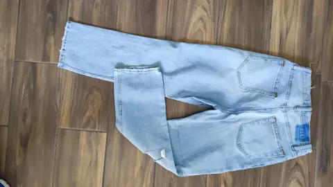 Pantalón tipo pescador de mezclilla azul claro, moderno, rasgado de ambas piernas, a la cintura.