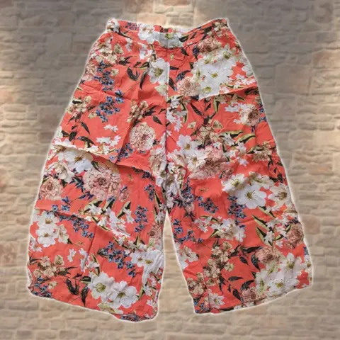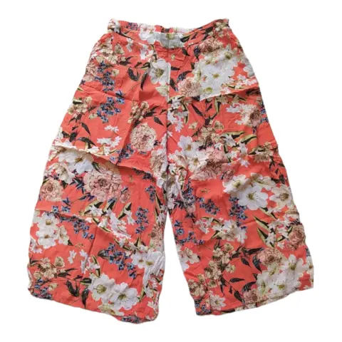 Pantalón culotte floreado pata de elefante. Pantalón culotte naranja con flores, marca Cotton on, talla XS/pp, resorte en cintura, muy ligero y fresco, con bolsas delanteras.Contorno cintura 64 cm estira hasta 76 cm.Contorno cadera 96 cm.Tiro 25 cm.Largo total 70 cm.