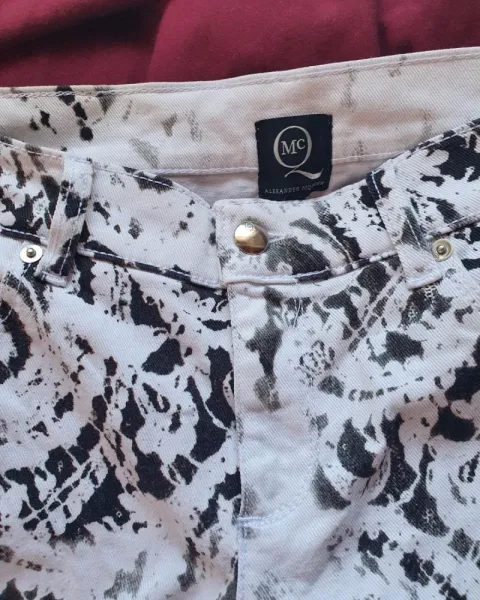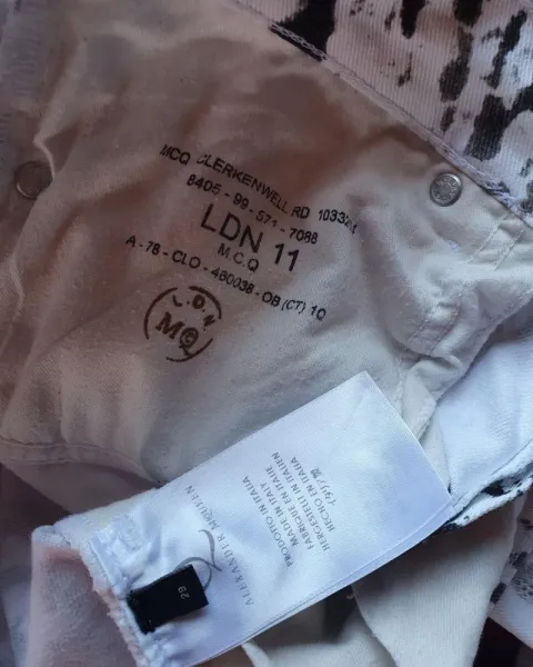 Pantalon de alexander McQueen. Dice talla 29, detalle tiene un puntito no muy se mira ver en la foto donde señalo con mi dedo esta hermoso no es muy entubadisimo esta en buen estado, original. Tiene un poquitito de strechAcepto ofertas que sean compra inmediata