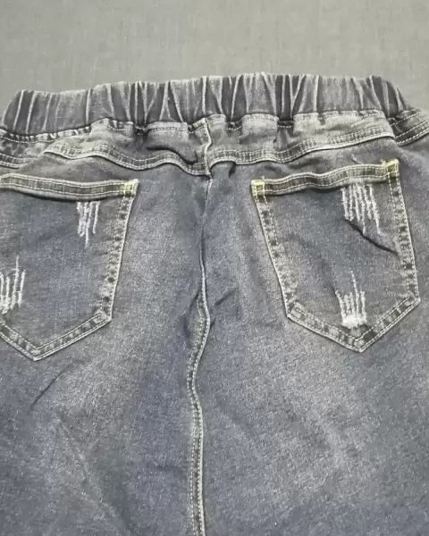 pantalón de mezclilla tiro alto a la cintura es entubado tiene botones metálicos en los tobillos es talla L/13 con resorte en la cintura