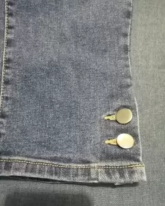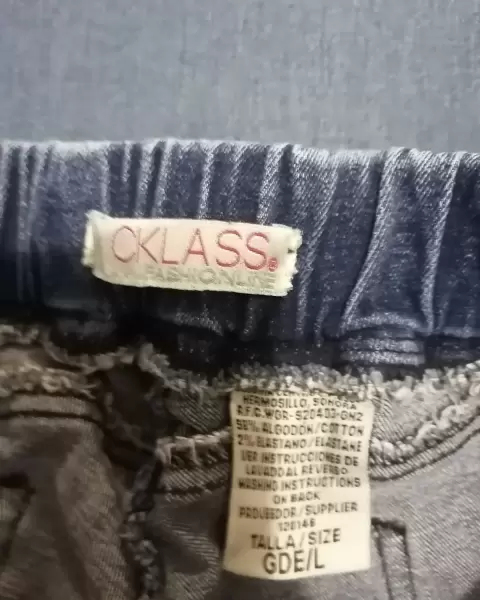 pantalón de mezclilla CKLASS. pantalón de mezclilla tiro alto a la cintura es entubado tiene botones metálicos en los tobillos es talla L/13 con resorte en la cintura