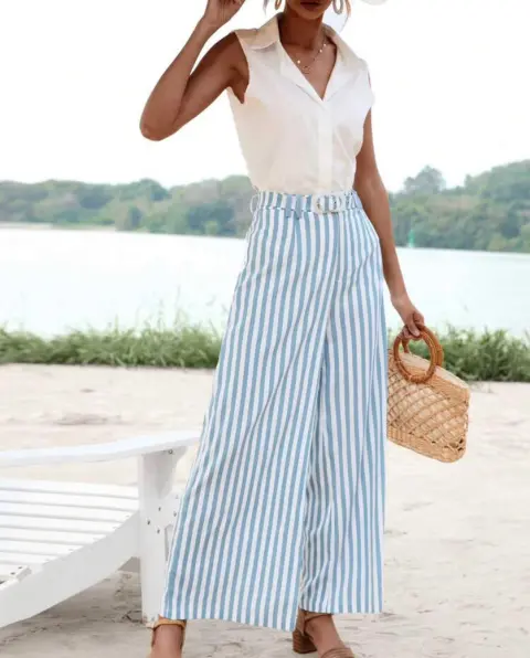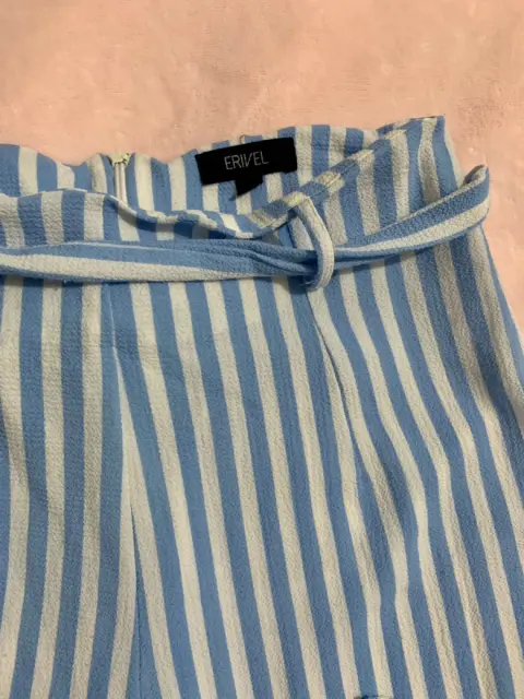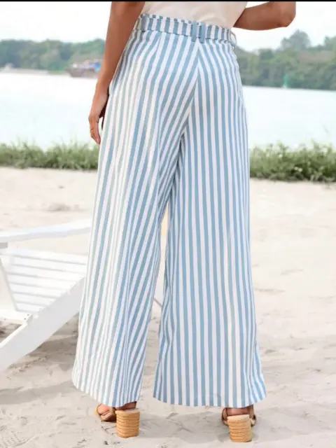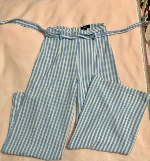 Pantalón de pierna ancha azul bebé con rayas blancas, tiene un cinturón de telita igual que el pantalón es largo como se ve en la foto 1! Es de tiro alto y queda como las ultimas fotos cintura: 69-74 cm largo: 110 cm talla S pero queda a M