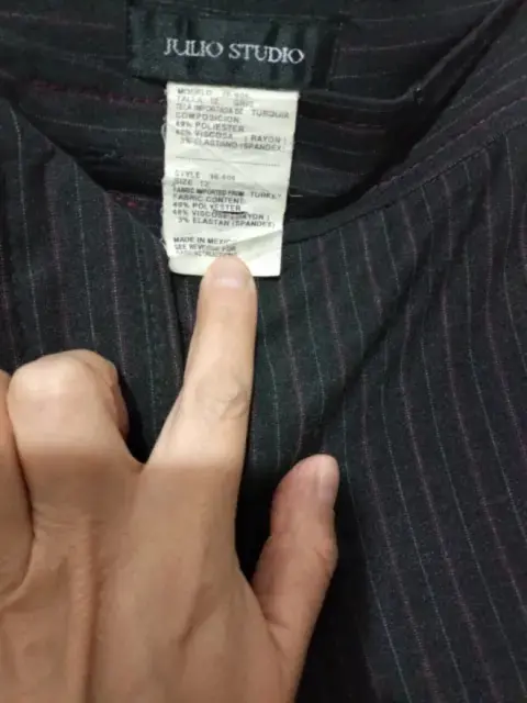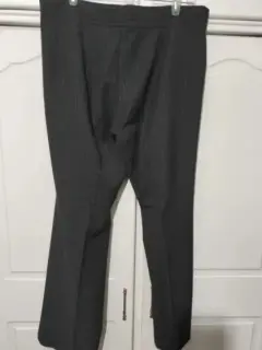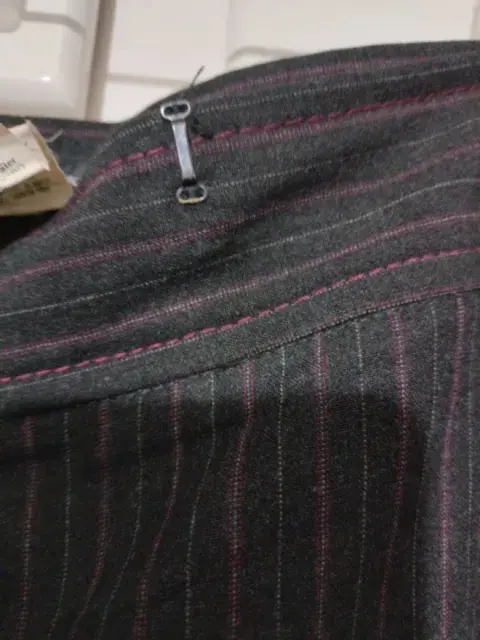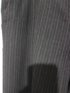 Pantalón de vestir a la cadera con dos bolsas al frente de cintura mide 48 CM de cadera 57 CM de largo 102 CM color gris Oxford con líneas en color vino y grises único detalle le falta un broche parte de abajo un poco ancho
