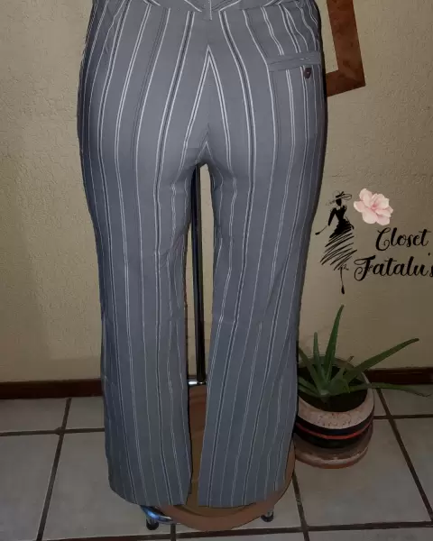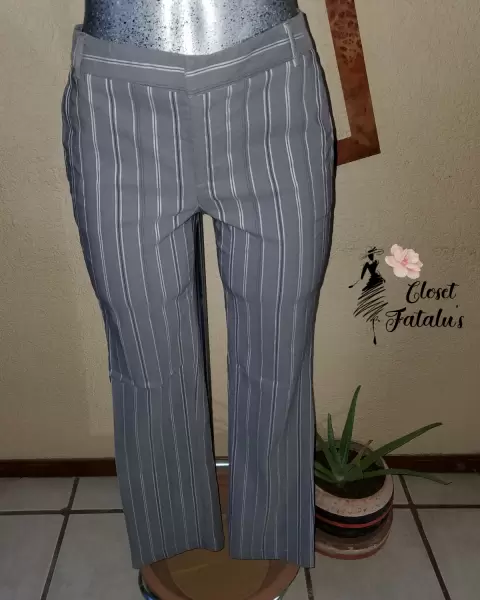 Pantalón tela fresca, corte recto con bolsas, ligeramente acampanado al final.Tela: 97% algodón y 3% spandexColor: Gris claro y rallas blancasTalla: 4 ( XS Hasta una S )arma muy padre.