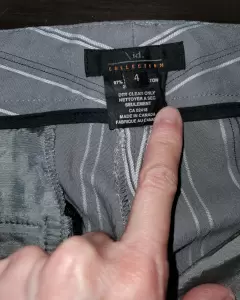 Pantalon de vestir a rallas. Pantalón tela fresca, corte recto con bolsas, ligeramente acampanado al final.Tela: 97% algodón y 3% spandexColor: Gris claro y rallas blancasTalla: 4 ( XS Hasta una S )arma muy padre.