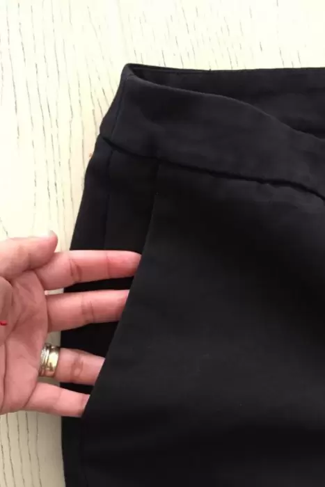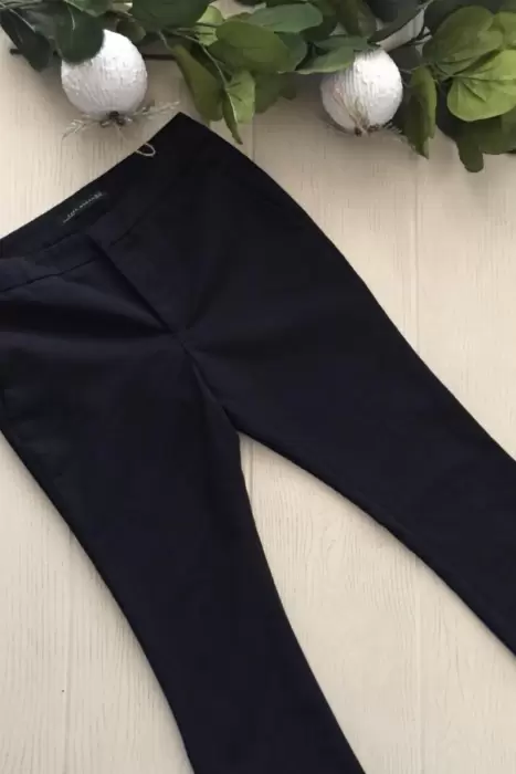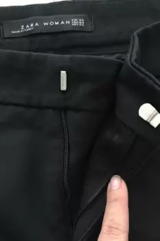 Pantalon negro de vestir, viene con el corte ligeramente acampanado en la parte de abajo, viene con boton, cierre y es tela tipo gabardina, el largo es corto, es decir debe llegar al tobillo.
