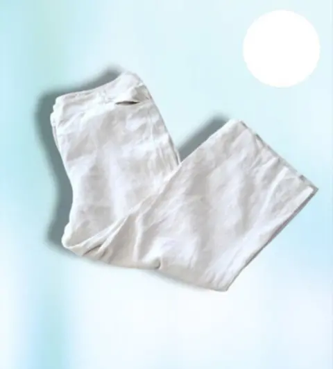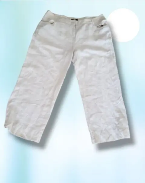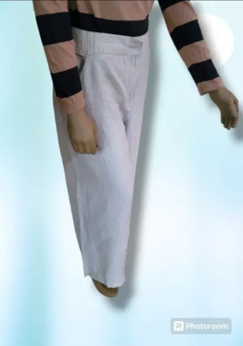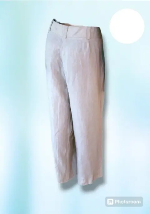Pantalon de Vestir Style & Company, talla plus 18-W, color beige, estilo recto con pierna ancha, bolsillos delanteros, cierre de cremallera y boton(faltante), pretillas para cinturon, con accentos de lineas doradas, hecho de lino, mide 48cm de cintura, 63cm de cadera, 70cm de entrepierna, 28cm de ancho en la parte baja de la pierna, 103cm de largo de la cintura hacia abajo en buen estado.