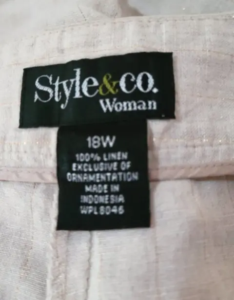 Pantalon de Vestir Style & Company. Pantalon de Vestir Style & Company, talla plus 18-W, color beige, estilo recto con pierna ancha, bolsillos delanteros, cierre de cremallera y boton(faltante), pretillas para cinturon, con accentos de lineas doradas, hecho de lino, mide 48cm de cintura, 63cm de cadera, 70cm de entrepierna, 28cm de ancho en la parte baja de la pierna, 103cm de largo de la cintura hacia abajo en buen estado.