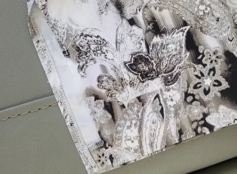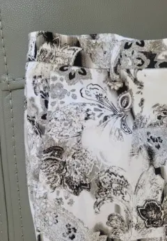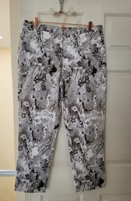 Pantalon estampado gris. Pantalon estampado gris, largo al tobillo, con aberturas laterales en bota, en poliester y elastano, medidas: cintura 44, cadera 57, largo 95Talla 12