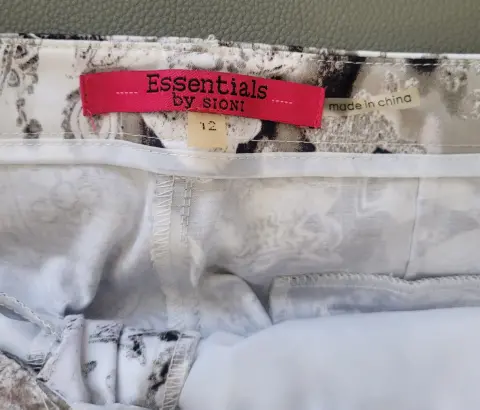 Pantalon estampado gris, largo al tobillo, con aberturas laterales en bota, en poliester y elastano, medidas: cintura 44, cadera 57, largo 95Talla 12