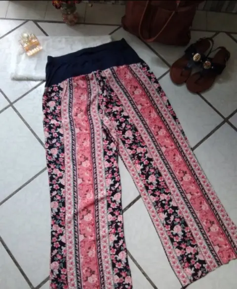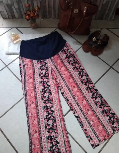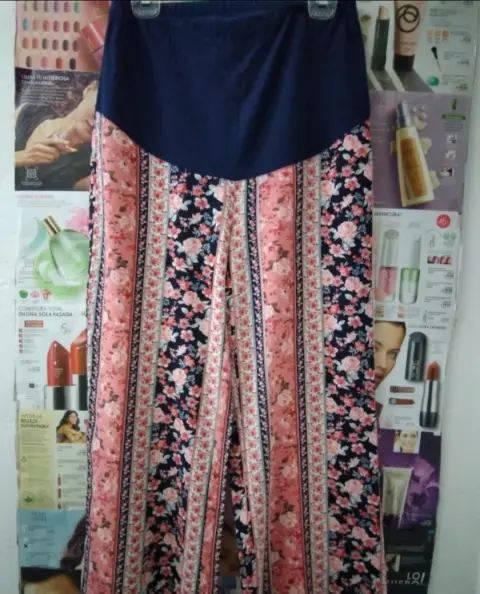 Pantalón Floral de Maternidad. Es un pantalón hermoso, súper ligero, tela tipo rayón con hermoso estampado y combinable, te va a encantar! Talla M; el detalle que tiene se muestra en la 5ta foto, al cortar la etiqueta se le hicieron dos hoyitos, está remendado, pero no afecta en lo absoluto por la blusa, porque los tapa sin problema. Te dejo medidas, cintura: 37 cm, cadera: 54 cm y largo: 103 cm.