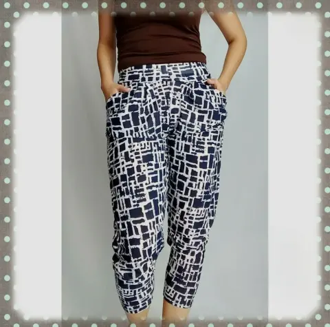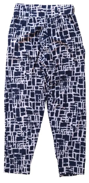 Hermoso pantalón muy fresco con diseño de cuadros en tono azul marino, con bolsas a lo costados y resorte en la cintura. Unitalla, marca Nare moda. 95% poliéster y 5% elastano.Largo total 88 cm.Contorno cintura 62 cm, estira a 72 cm.Contorno cadera 100 cm.Tiro 31 cm.