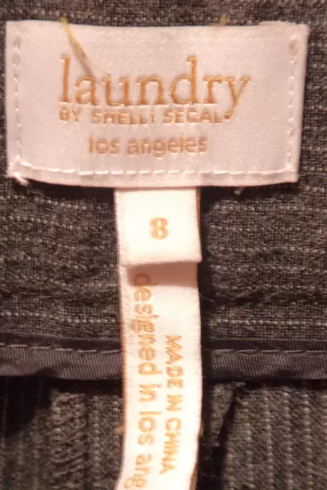 Pantalón gris Laundry. Pantalón gris con tenúes rayas blancas, bolsas a los costados y en la parte de atrás, corte ligeramente acampanadoTalla 8 americana con las siguientes medidas:Ancho cintura 39 cmsAncho cadera 49 cmsLargo tiro a bastilla 70.5 cmsEn muy buenas condiciones, ya que tuvo pocas puestas