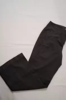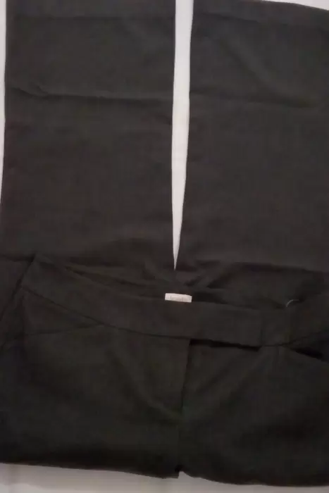Pantalón gris con tenúes rayas blancas, bolsas a los costados y en la parte de atrás, corte ligeramente acampanadoTalla 8 americana con las siguientes medidas:Ancho cintura 39 cmsAncho cadera 49 cmsLargo tiro a bastilla 70.5 cmsEn muy buenas condiciones, ya que tuvo pocas puestas