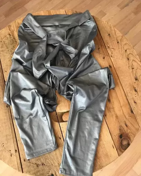 Padrísimo pantalón entubado o Leggins color plata con moño y cintura alta excelente precio y calidades nuevo a estrenar ya es mi mejor precio por la comisión de la que no te lo gane