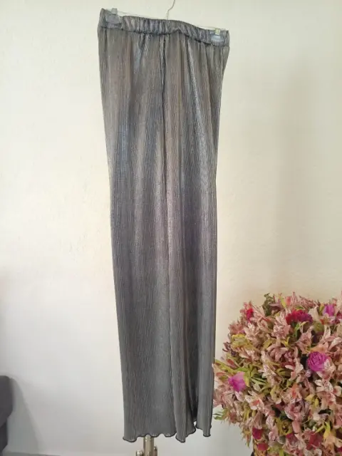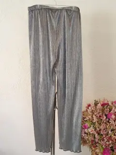Pantalón metálico plata curvy, de resorte y pierna amplia recto, tela muy cómoda.