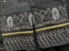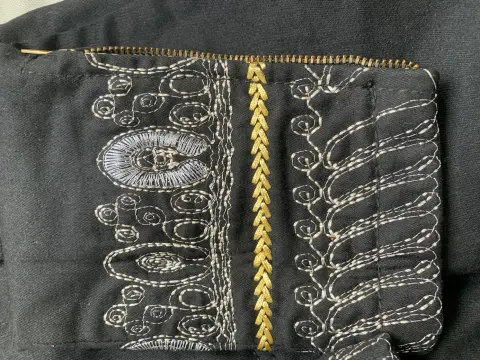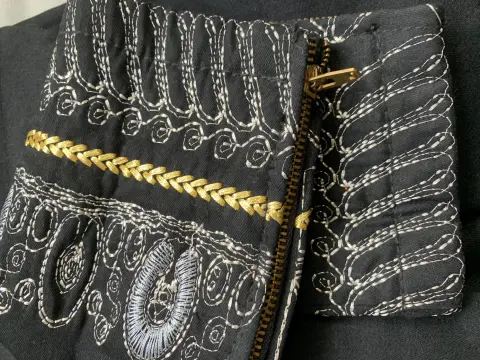 Pantalón negro entubado, con detalles bordados en el bajo de la pierna, con cierres en los tobillos