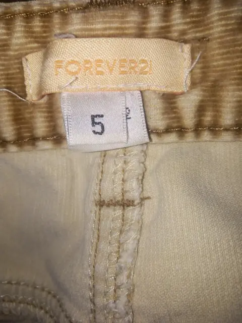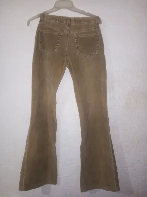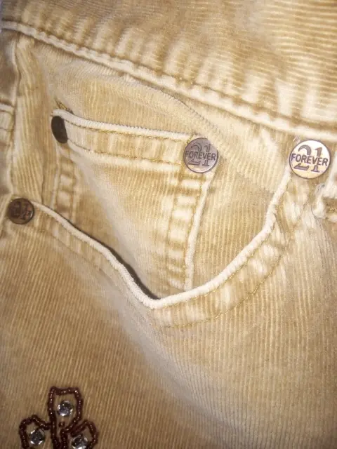 Pantalón en tela pana stretch en color café con adornos en chaquira al frente, 5 bolsas 3 al frente, cierre y botón. De cintura mide 78 cm, cadera 92 cm y de largo 97 cm.
