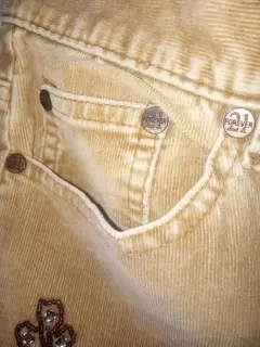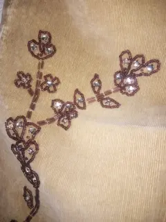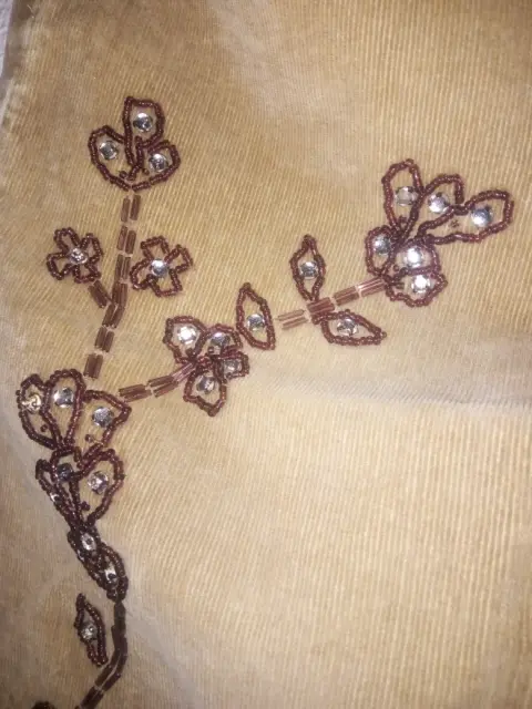 Pantalón pana adornos en chaquira. Pantalón en tela pana stretch en color café con adornos en chaquira al frente, 5 bolsas 3 al frente, cierre y botón. De cintura mide 78 cm, cadera 92 cm y de largo 97 cm.