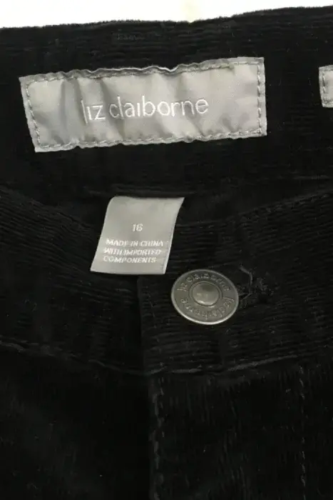 Pantalón de pana o terciopelo negro. Ancho y acampanado de la pierna. Bolsillos a los lados y traseros. Marca Liz Claiborne, talla 16. Largo aproximado 109cm, Cintura 46cm aproximadamente.