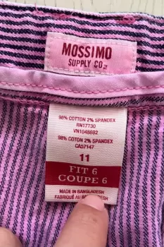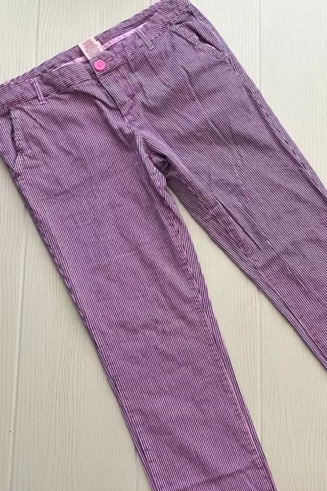 Pantalon rosa de rayitas azules, corte recto tela es strech, viene con cierre y broche al frente.Medidas:Cintura: 90 cmCadera: 104 cmLargo: 100 cmTiro: 22 cm