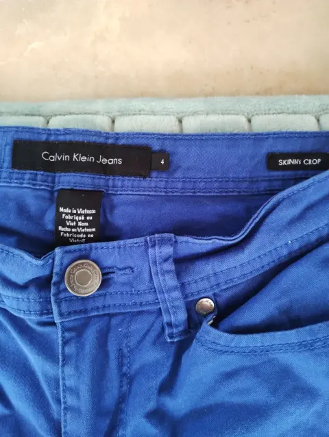 Pantalón azul marca Calvin Klein talla 4 queda a sCorte skinny cropEl corte crop se refiere a que es corto tipo capriTiro medioCasual 💙 Usado sin detalle, mide 39 CM de cintura, 22 CM de tiro, 47 CM cadera, 85 CM largo