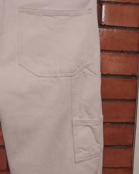 Pantalón tipo cargo Cuidado con el Perro. Pantalón beige, tiro alto, pierna ancha, tipo cargo, sin ningún detalle.