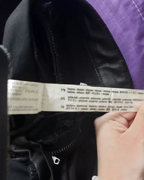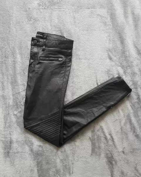 ntalón con efecto piel en perfecto estado sin defectos, es tiro alto y bonitos detalles como el decorado plisado tipo biker y cierres en los laterales de los tobillos.Los use dos veces y no másLos vas a amar se ven super bien, estiran no son rígidos