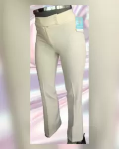 Pantalón Vestir Raya Diplomática MARFIL. Pantalón de vestir raya diplomática estilo elefante de cintura alta, color MARFIL y rayas en tono ROSA BEBÉ, cierre p/cremallera baja y botonadura triple. Dan una figura extraordinaria por el corte y la composición de la tela. Talla 30 (REDUCIDA, da mejor a 28). Dimensiones cms: 37.5 cintura, 26.5 tiro, 45 cadera, 26.5 pierna, 104.5 largo. 94% poliéster, 6% elastano. Para lavado en casa.