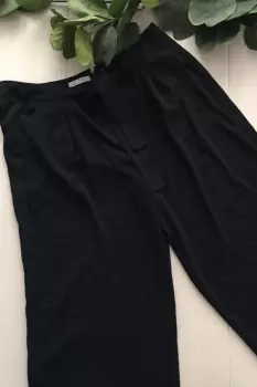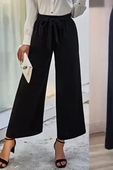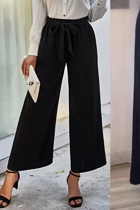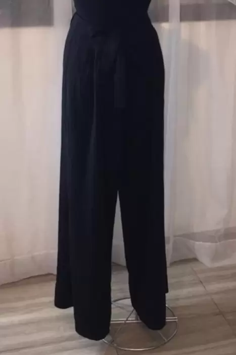 Pantalón de pierna ancha con cinturón, tela tipo vestir, viene con el amarrado enfrente pero las cintas solo vienen costuradas de adelante asi el amarrado es un poco mas decorativo, no tanto que apriete desde atras. Trae cierre y broche, bolsillos adelante y atras y pliegues enfrente.Color: NegroMedidasCintura: 103 cmLargo: 111 cmNo strech / No estira