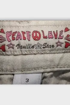 PEACE AND LOVE Pantalón Dama Algodón Beige XS 3. PEACE AND LOVE Pantalón Dama Algodón Beige XS 3Marca: PEACE AND LOVEOrigen: ChinaMaterial: 98% Algodón 2% SpandexTalla: XS - 3Estilo: PantalónPatrón: CampbellColor: BeigeCierre: Cremallera y BotónCintura: 37 cmCadera: 44 cmLargo: 94 cmTiro: 13 cmMuslo: 24 cmEntrepierna: 27 cmRopa de USO en muy buen estadoModelo único Lo que ves es lo que comprasAclara todas tus dudas antes de comprar