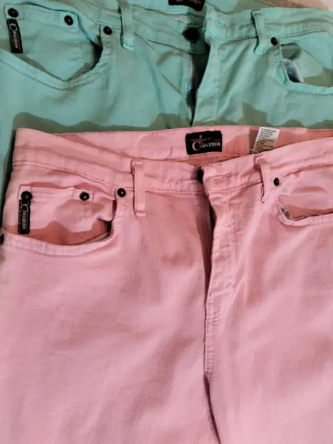 1 par de jeans de colores claros de moda de uso, buen precio (a escoger color naranja, verde claro, rosa) Talla 34-361 falda recta verde claro, talla 34.1 pantalón Oscar de la renta Amarillo paja talla 341 pantalón rojo de deportes (pants) talla 34