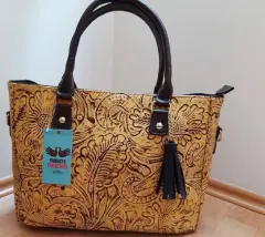 Bolsa amarilla con cartera cincelada. Contiene una bolsa amplia cincelada de gran tamaño con correa para el hombro y su cartera del mismo diseño a doble cierre y con correa para muñeca en un solo paquete