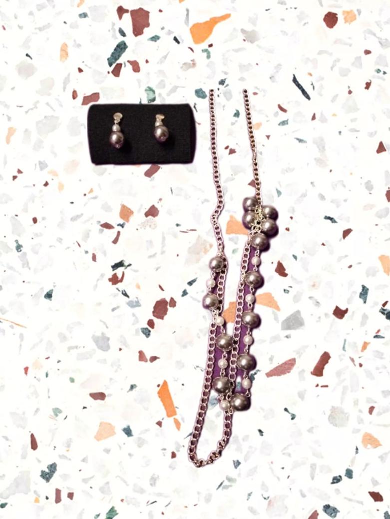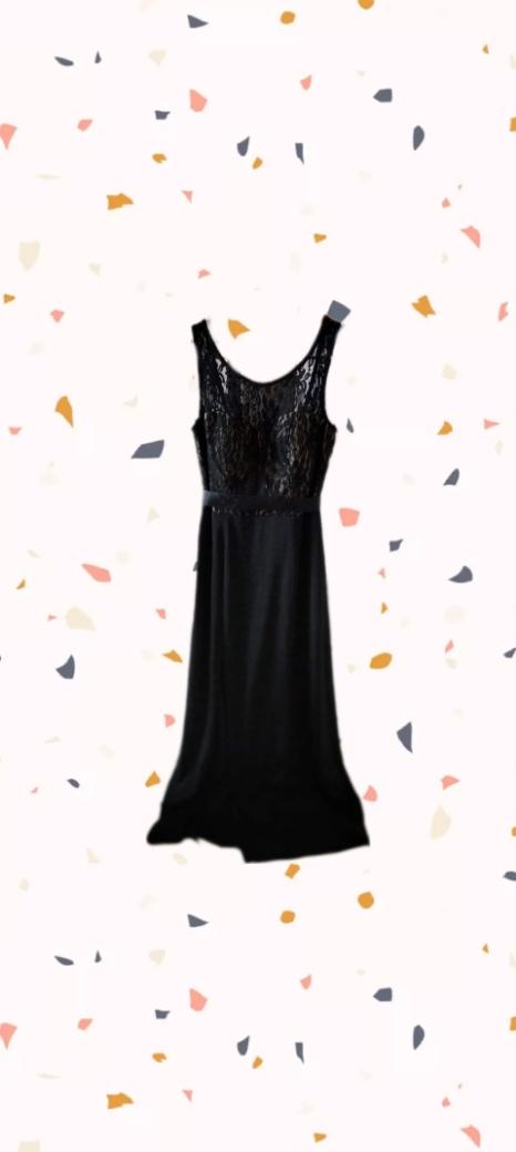 Vestido negro largo con abierta en la pierna, collar y aretes, pashmina o chalina oro rosado o rosa metálico y bolso tipo clutch color rosa metálico