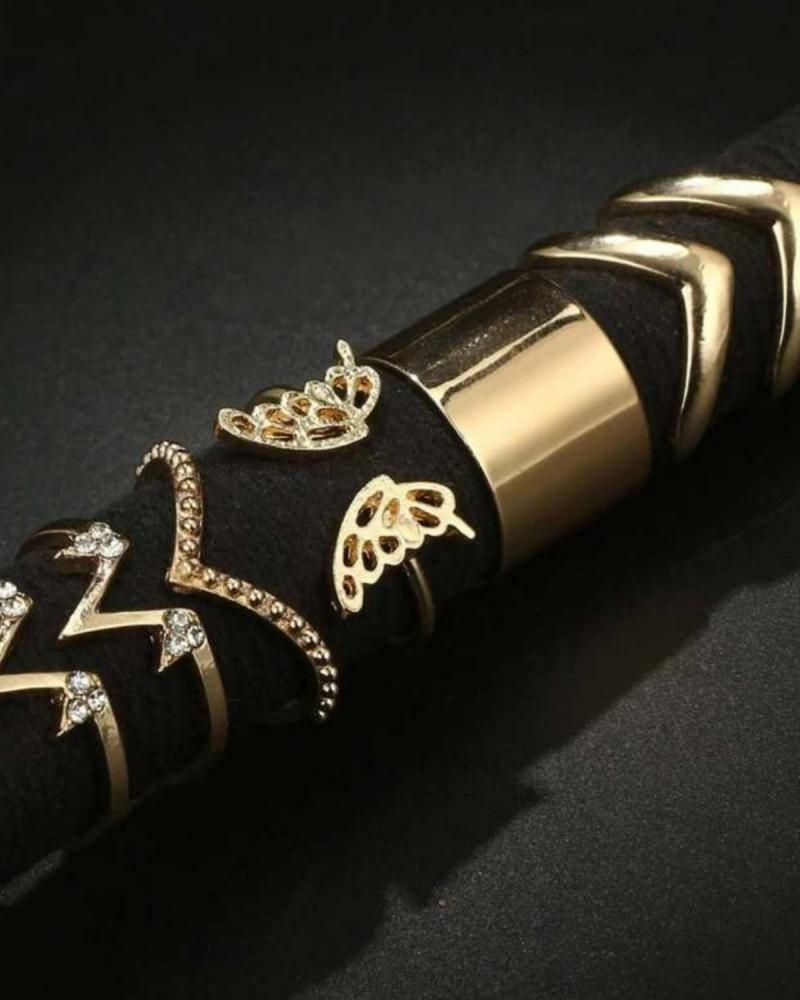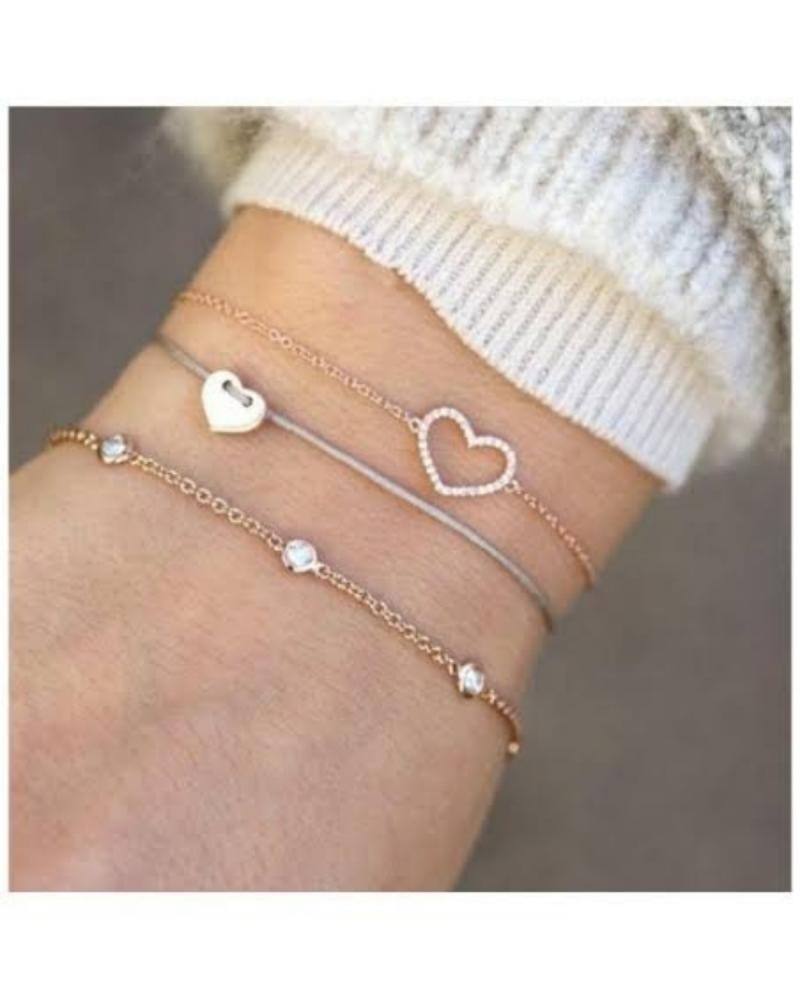 Set de 3 pulseras de corazón color Dorado con Cristales y textil azul más set de 7 Anillos dorados con pedrería color Dorado.