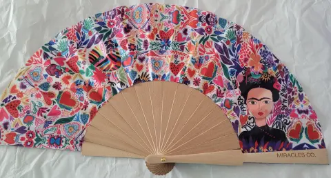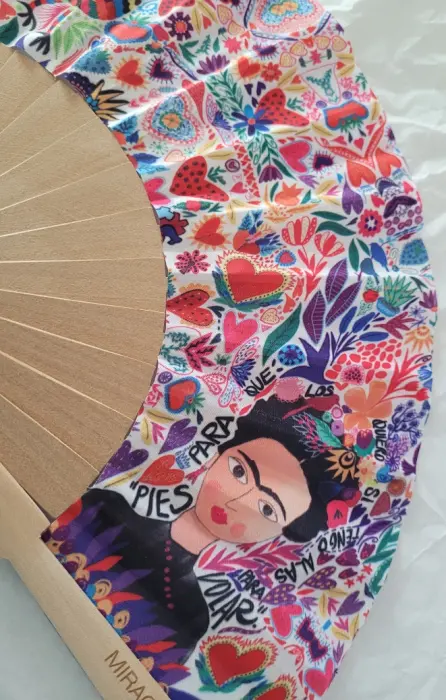 Abanico para dama estilo Fridita. 🪭A donde quiera que vayas, Abanicos Miracles Co. Tu mejor accesorio.🔥 Abanicos de tela impresa y varillas de madera. 23x44 cm. Ideal para tú bolso.