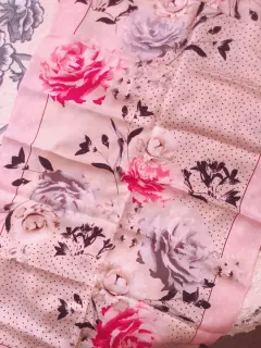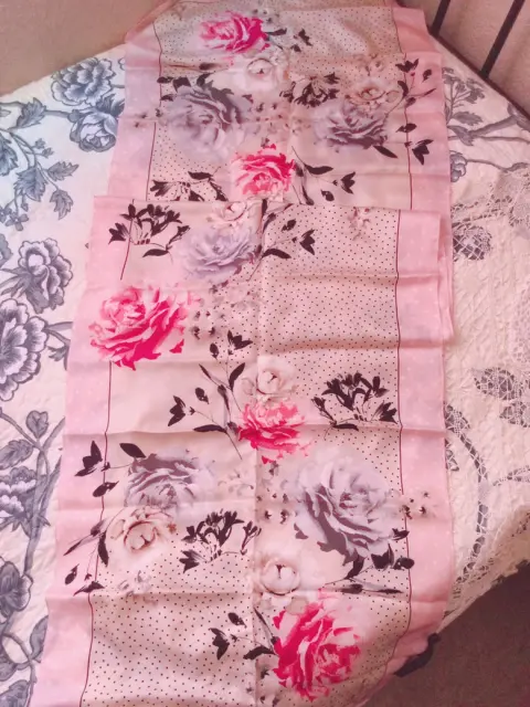 Linda y bella mascada de seda color rosa, bolitas y rosas, rectangular, ancha y larga, finísima, sin detalles ni roturas. Por favor checar bien las fotos para evitar devolución o calificación no concordante a mi descripción. Envíos los lunes ❤️