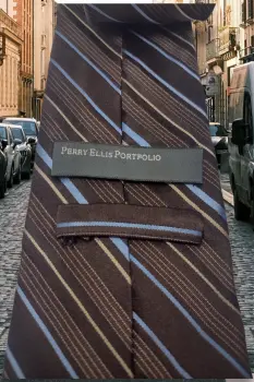 Corbata Clásica Perry Ellis Marrón a Rayas SedaEn muy buen estado generalCorbata ClásicaHecha en China En SedaEstilo: ClásicoMaterial: SedaAncho: 9 cmLargo: 1.53 mtOrigen: ChinaAclaro tus dudas
