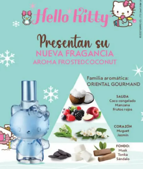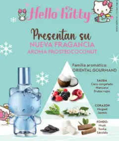 Hello Kitty Frosted Coconut. Colonia con atomizador para dama. Hello Kitty Frosted Coconut. Contenido 60 ml. Nueva. Notas de salida de coco congelado, corazon de Muguet y Fondo de Haba tonka.