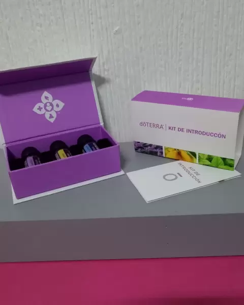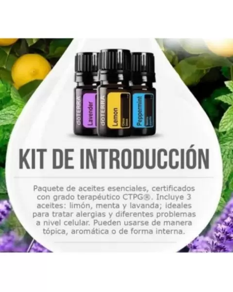 El kit de introducción a los aceites esenciales incluye 3 frascos de 5 mL de los aceites esenciales dōTERRA Lavanda, Limón y Menta; para compartir bienestar.Incluye guía de usos.