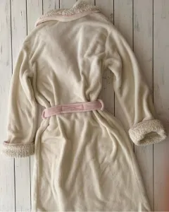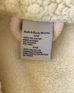 Bata de borreguito Bath & Body Works. Talla: S/M, 100% poliéster, súper calientita y suave, mangas y cuello con detalle de borrego, la cinta rosa con la que se amarra viene pegada a la bata, por dentro trae un listón rosa para amarrar, medidas: 57 cm de axila, 52 cm de hombros, 118 cm de largo. Es beige con detalles rosa.